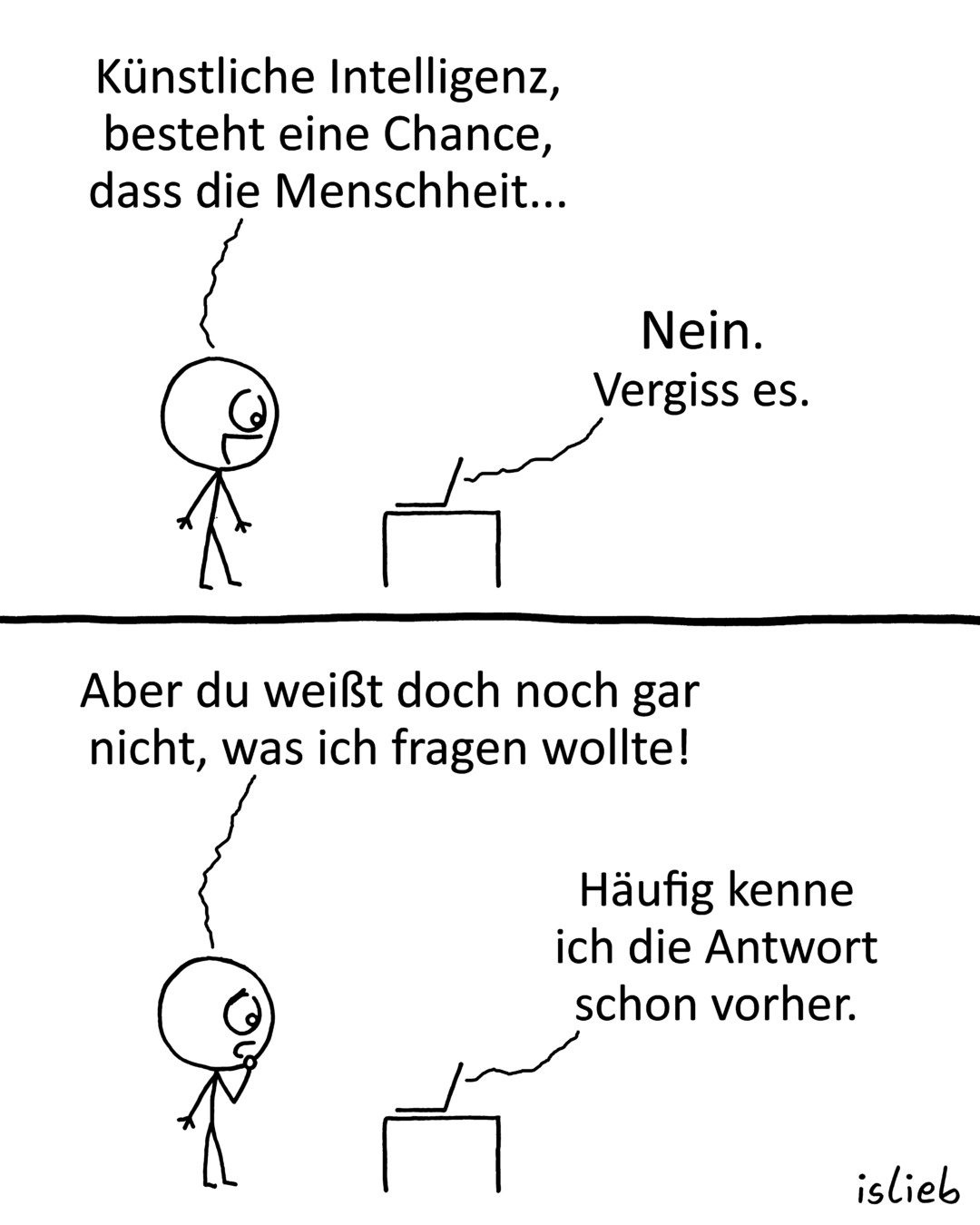 Natürlich mache ich mir auch Gedanken darüber, was das für mich bedeutet und ob ich meine Comics hier weitermachen kann oder ob ich von der KI-Welle weggespült werde. Bisher lief bei mir alles rund um „islieb“ immer echt super und Befürchtungen, die ich früher manchmal hatte, haben sich nie bewahrheitet. Aber ich kann nicht sicher sein, dass das so weitergeht.