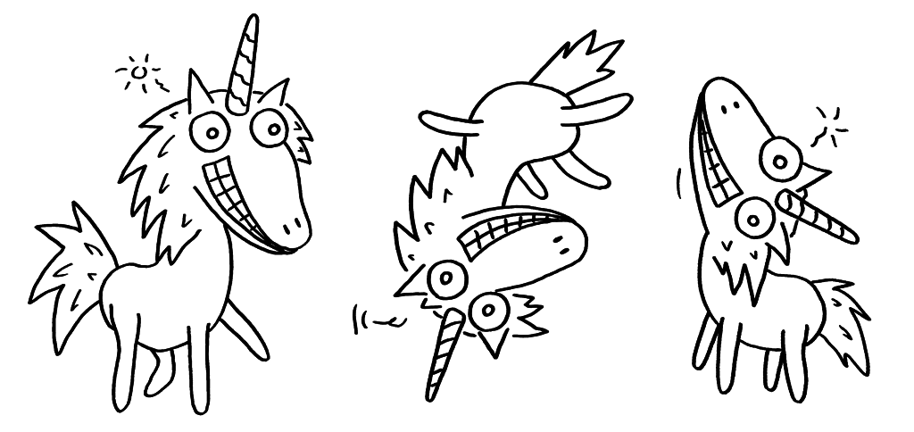 Das mit den Einhörnern ist total eingeschlagen und was ich aus Nachrichten rausgelesen hab, war wahnsinnig positiv. Ich glaub, das war so der Moment, wo ich mir überlegt hab, dass es echt Sinn machen könnte, so viel Zeit mit… Strichmännchen-Krakeln zu verbringen. Und seither hab ich’s eben gemacht. 🙂