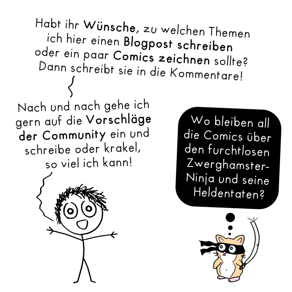 Wenn ihr Themen-Wünsche für Blog-Einträge und Comics habt, immer her damit! Kommentiert einfach.