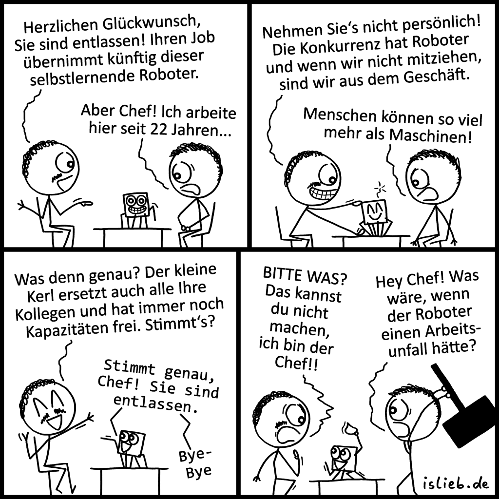 Das hier war mal wieder als Comic für die Unfallkasse gedacht. Mal sehen, ob er genommen wird. Der Hammer könnte zu brutal sein. Aber wer weiß! Habe kein gutes Gespür dafür, was dort noch okay ist und was nicht. Ich weiß nur, dass ich mich eigentlich immer bemüht habe, denen wirklich harmlose Comics abzuliefern, aber dort wohl trotzdem schon interne Diskussionen ausgelöst habe, wie weit Humor gehen darf. Hach ja! Ist eben alles relativ 😉
