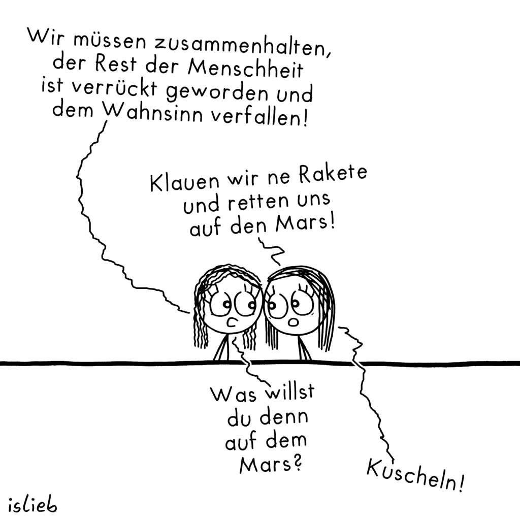 Die Köpfe und Augen der Figuren sind so groß, damit sich Gesichtsausdrücke besser erkennen lassen, die Schrift muss groß genug sein, dass sich alles auch am Handy noch gut lesen lässt, ohne zu scrollen oder zu zoomen. Die Linien, die von den Figuren zum Text führen, sehen so zittrig aus, damit sie sich besser vom Rest der Zeichnung unterscheiden lassen und das „islieb“ steht immer da, wo es am wenigsten stört.