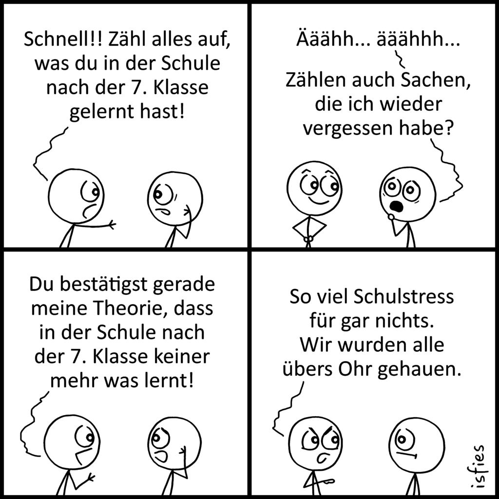 (Nur fürs Protokoll denke ich schon, dass ich nach der 7. Klasse hier und da etwas gelernt habe. Auch wenn mir jetzt spontan wenige Beispiele einfallen… hüstel. Na jedenfalls fand ich den Comic trotzdem ganz lustig.)