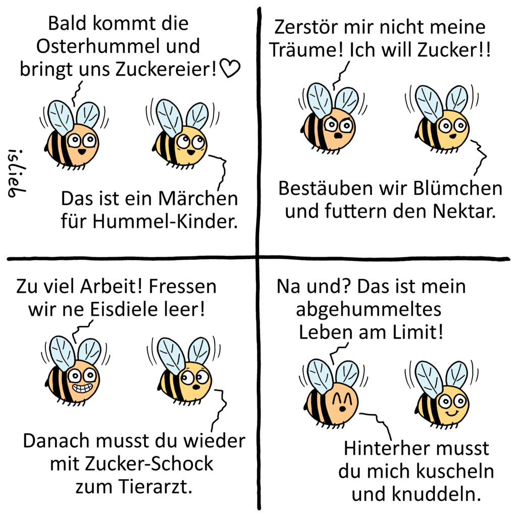 Für den Anfang wollte ich hier unbedingt nen Comic mit Oster-Bezug reinstellen, aber in den nächsten Tagen benutze ich den Kalender auch gern mal für etwas experimentellere Sachen – wenn mir welche einfallen. Ach so, natürlich schreibe ich öfter auch noch ein paar Zeilen dazu und ein, zwei, drei Mal soll es ein interaktives Kalender-Türchen geben.