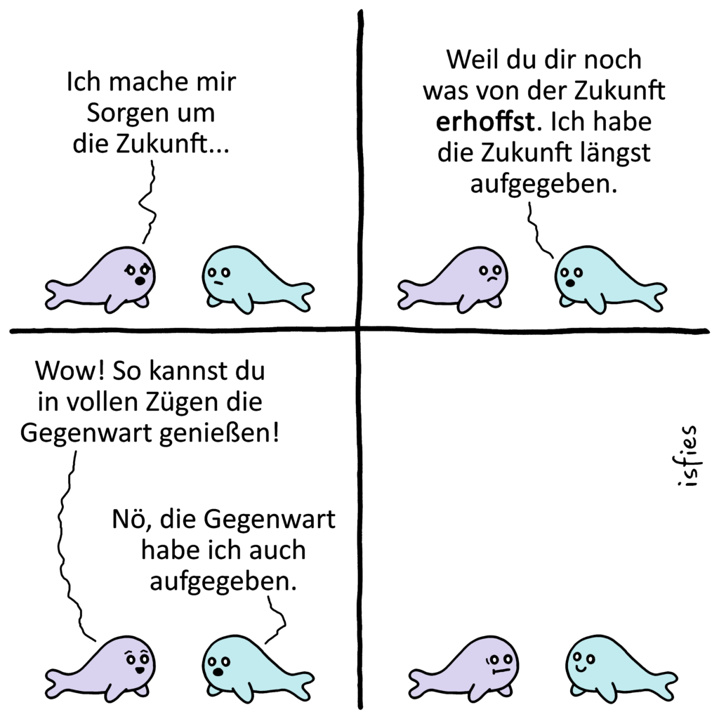 Und dann haben Leute, die bei mir mitlesen, sicher auch ganz unterschiedliche Erwartungen. Einige hätten sicher gern öfter mal nen Comic, der ein bisschen zur aktuellen Situation passt, andere wollen eigentlich lieber leichte Unterhaltung und was Fröhliches, um den ganzen Alltag und alles andere mal für nen Moment wegzuschieben.