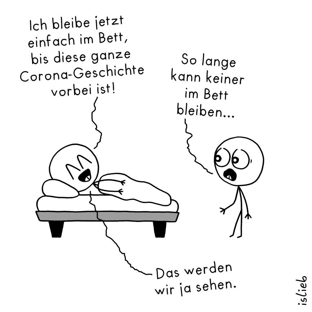 Hatte heute Morgen beim Aufwachen (na ok, heute VORMITTAG beim Aufwachen) so eine Vision, dass es doch total klasse wäre, wenn ich die Zeit jetzt nutze, um zum ersten Mal nen ECHTEN Frühjahrsputz durchzuziehen, alles ansehnlich herzurichten, wie noch nie auf gute Ernährung, Schlaf und Sport zu achten und dann in zwei Wochen/Monaten/Jahrzehnten in körperlicher und geistiger Bestform aus diesem Lockdown zu kommen, mit unzähligen gelesenen Romanen, gekrakelten Comics von nie gekannter Kreativität, zwei neuen Fremdsprachen und schick sortierten PC-Dateien.