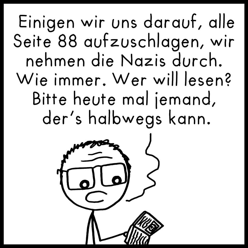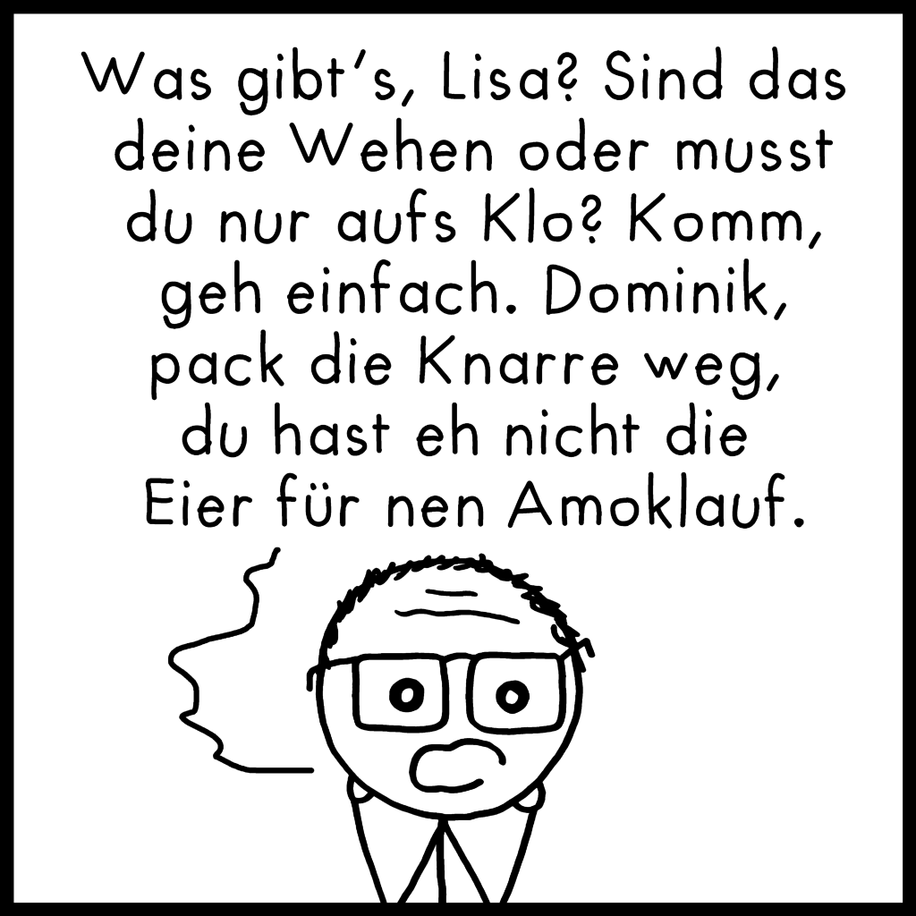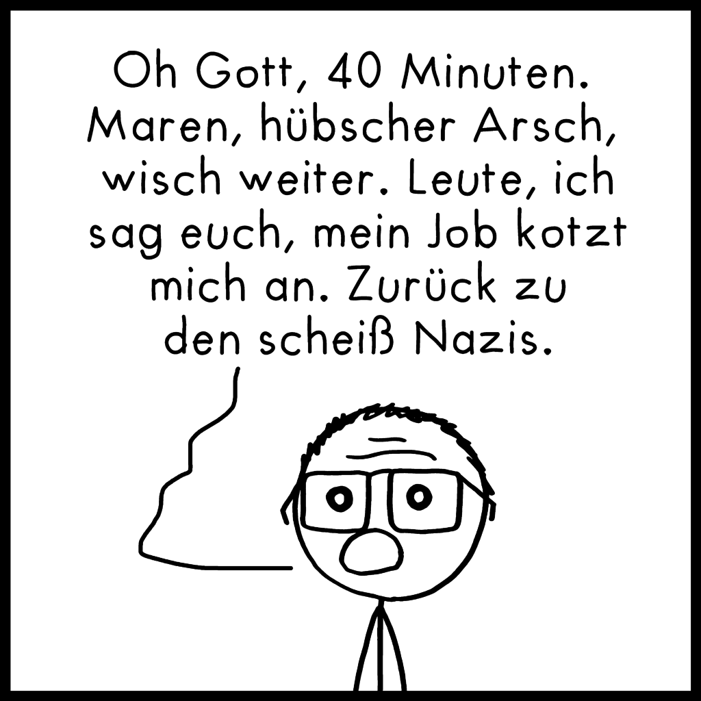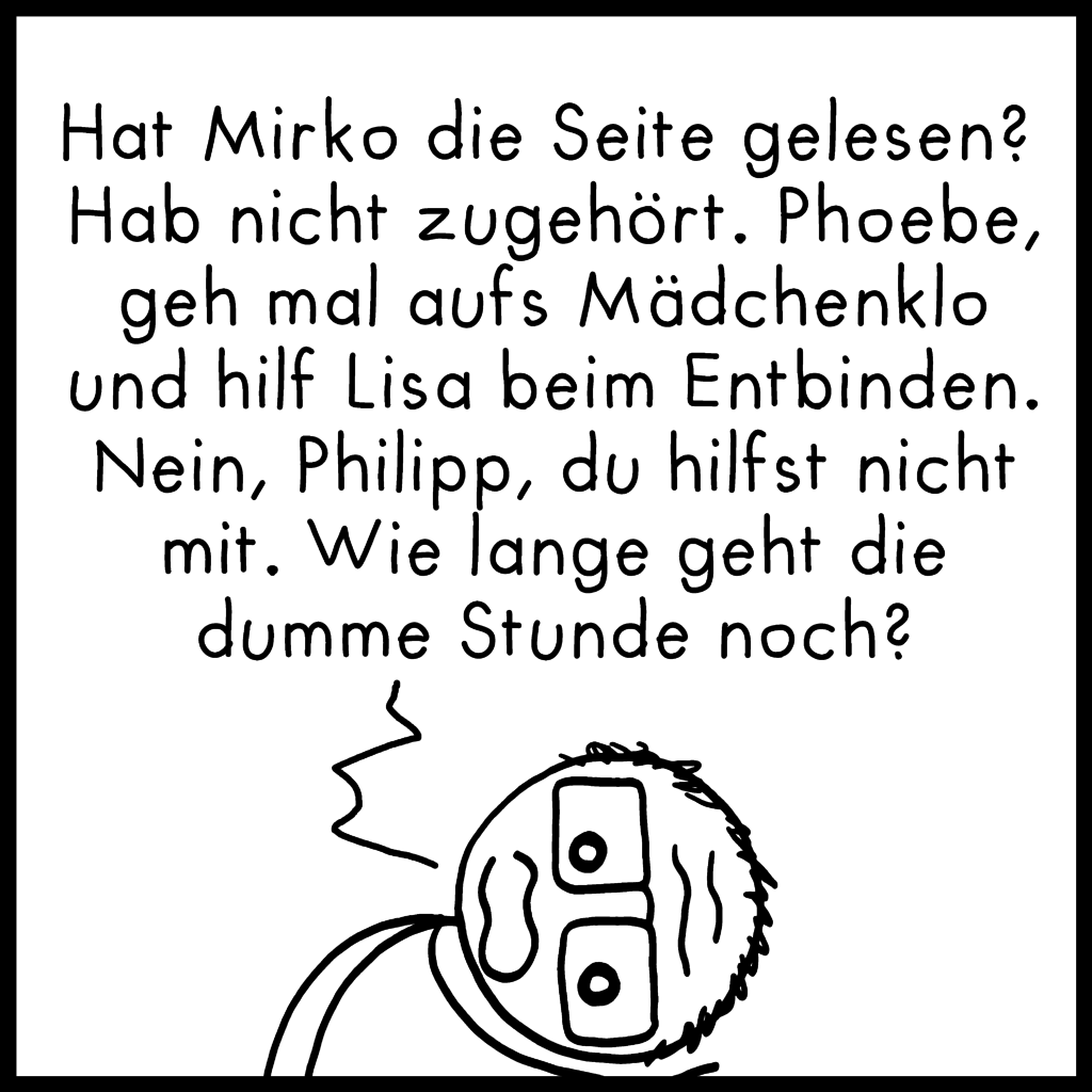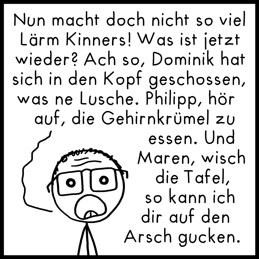 Hier noch ein längerer Comic, der in die Kategorie fällt: „Bisschen grob, Geschmackssache, viel Text“. Bitte nicht auf die Goldwaage legen, hab den im etwas übermüdeten Zustand spontan zusammengeschrieben. Falls euer Name im Comic auftaucht, fühlt euch bloß nicht angesprochen!^^