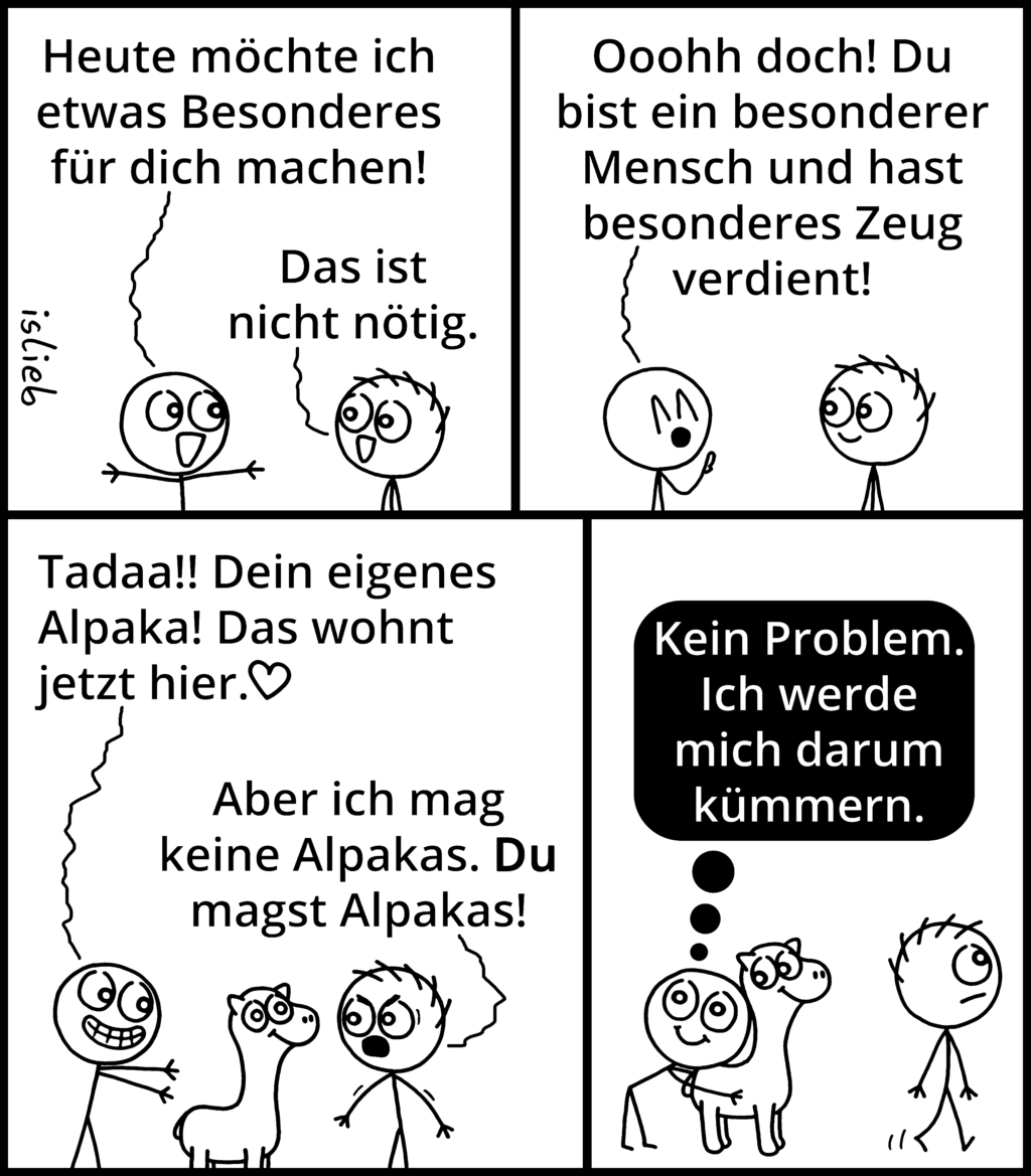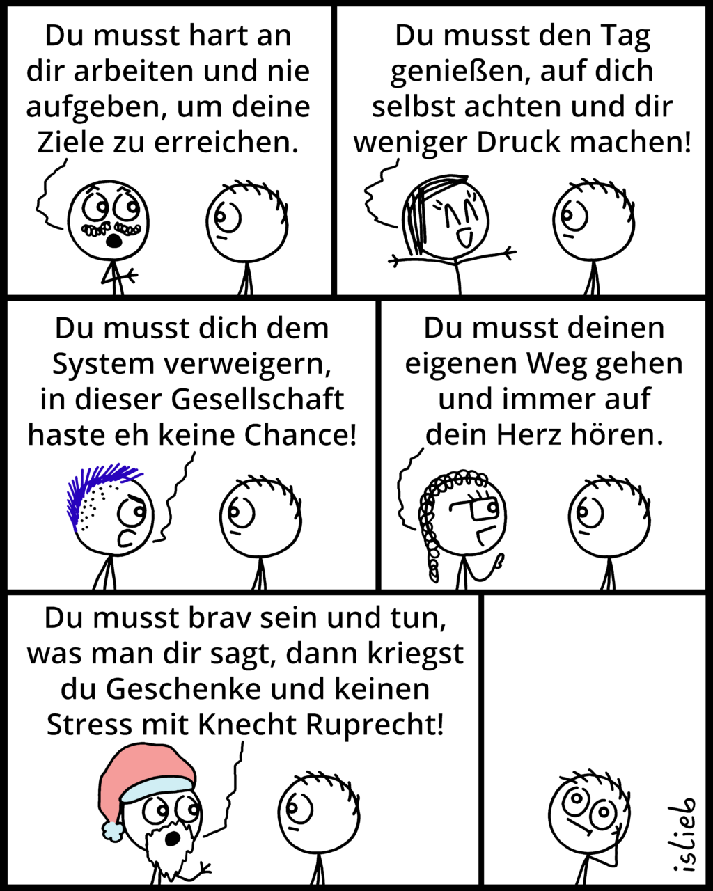 Also ausnahmsweise wirklich mal ein Statement in nem islieb-Comic. Nachdem ich den vorhin auf Facebook gepostet hatte, musste ich aber feststellen, dass ihn trotzdem wieder viele knallhart so verstanden haben, wie es ihrem eigenen Weltbild entsprach. Aber vielleicht ist das ganz ok so und vermeidet Streit.