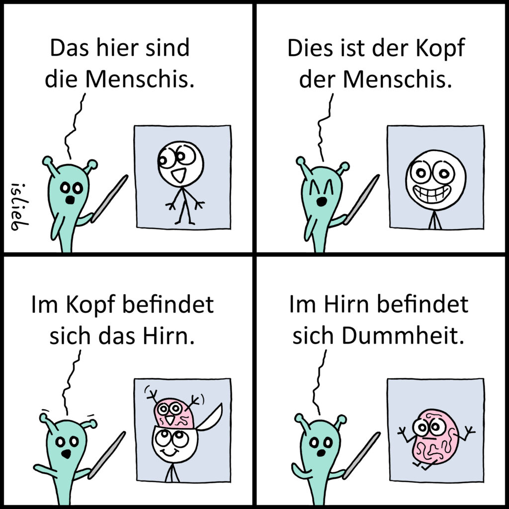 Die ersten beiden Textblöcke im Comic oben waren eigentlich zwei ganz kleine, einzelne Cartoons, die ich neulich so nebenher gemacht hatte und die auch beide gut ankamen. Aber ich fand die zu witzlos, also hab ich sie hier kombiniert und nen anderen Comic draus gemacht. Sozusagen Comictext-Recycling.