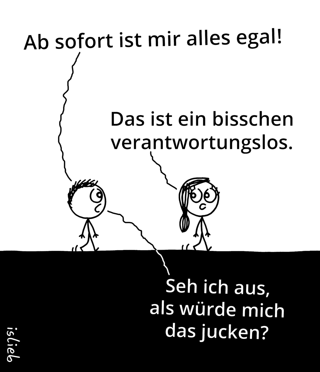 Mich beschäftigen teilweise Themen, die sonst fast niemanden interessieren und ich finde auch so einiges lustig, das andere eventuell irritiert. Ich glaube, generell bin ich zwar wirklich ganz lieb, aber ich habe auch so ein paar verkorkste Seiten und die Comics werden sympathischer, wenn ich die beim Zeichnen ein Stück runterregel. Echt jetzt! 😀