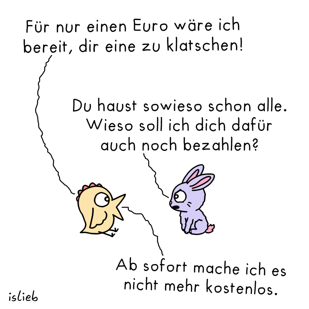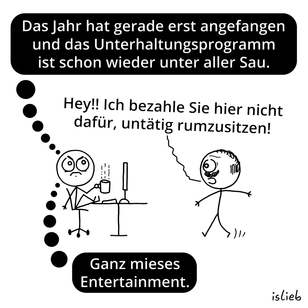 Bei dem Comic da oben dachte ich aber, ich war ziemlich klar, denn ich fand es echt immer albern, wenn sich Generationen über andere Generationen aufregen. Seit ich mit den Comics hier letztendlich selbst so ein bisschen was Unternehmerisches mache, finde ich auch zunehmend Unternehmer absurd, die rumheulen oder die Schuld bei anderen suchen, wenn ihr Unternehmen nicht läuft. Selbst wenn sie vielleicht recht haben, hilft das kein Stück weiter und wirkt auf mich einfach extrem… un-unternehmerisch.