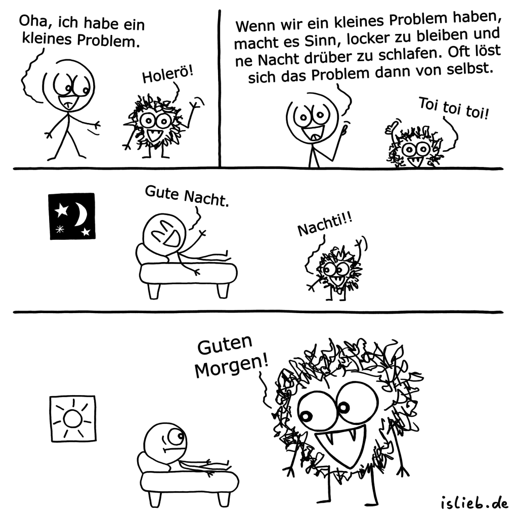Bei meinem Tagesrhythmus fällt immer das Problem an, dass er sich nach und nach ganz unauffällig immer weiter nach hinten verschiebt. Vielleicht ist der Kaffee schuld, vielleicht liegt es auch daran, dass mich häufig niemand zwingt, früh aufzustehen. Was sich bestimmt klasse anhört, aber andererseits kommt dann plötzlich irgendein Termin, für den ich DOCH früh aufstehen muss und das wird extra-hart, wenn die Tagesrhythmus-Verschieberei schon in vollem Gange ist.